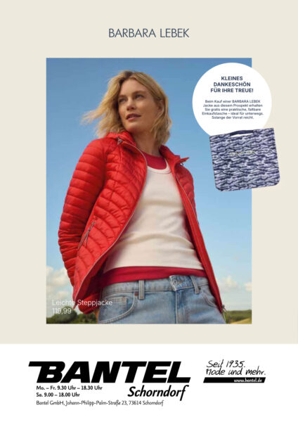 *Beim Kauf einer BARBARA LEBEK Jacke aus unserem aktuellen Barbara Lebek Prospekt erhalten Sie gratis eine praktische, faltbare Einkaufstasche – ideal für unterwegs.